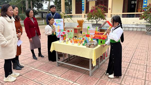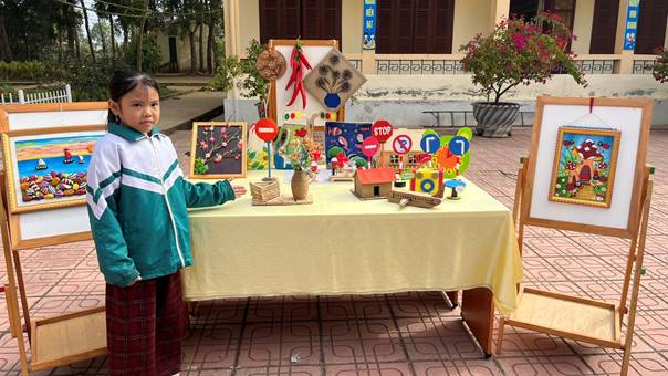 Khối lớp 1 mang đến những sản phẩm đơn giản nhưng gần gũi như mô hình ngôi nhà, vườn cây, phương tiện giao thông làm từ vật liệu tái chế. Qua đó, các em bước đầu làm quen với tư duy thiết kế và ý thức bảo vệ môi trường.