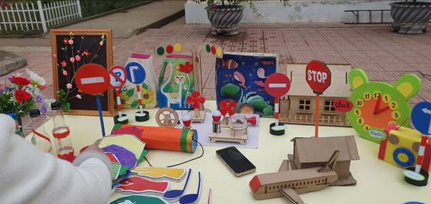 Đối với khối 1, các em học sinh đã mang đến nhiều sản phẩm gần gũi, phù hợp với lứa tuổi như mô hình đồ dùng học tập thông minh, đồ chơi tái chế từ vật liệu quen thuộc, mô hình ngôi nhà xanh thân thiện với môi trường. Các sản phẩm thể hiện sự khéo léo, sáng tạo và bước đầu hình thành tư duy khoa học cho học sinh.